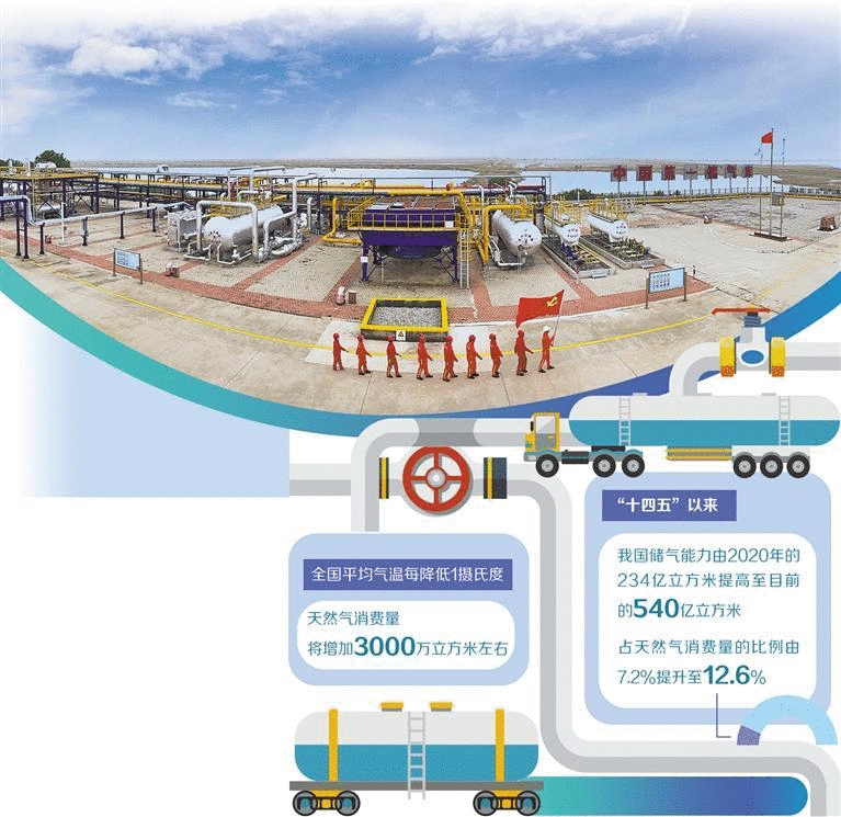 国家能源地下储气库研发中心的数据显示,“十四五”以来,我国储气能力由2020年的234亿立方米提高至目前的540亿立方米,占天然气消费量的比例由7.2%提升至12.6%,我国储气能力达到国际先进水平。其中储气库工作气量超过300亿立方米,比“十三五”时期末增加115%,尖峰日采气能力由1.4亿立方米提升至目前的3.5亿立方米,各项指标均实现翻番。