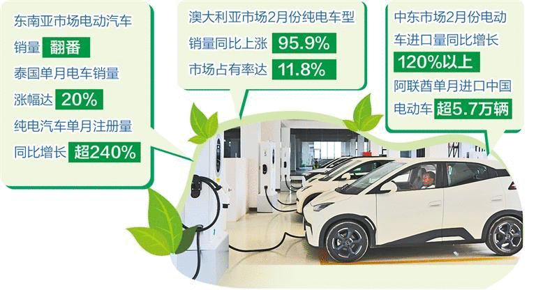 在这个过程中,中国电动汽车品牌表现强劲。2月份,中国品牌汽车在澳大利亚单月销量达到22362辆,首次超过日本的21671辆,成为该国最大进口来源国。新能源车渗透率升至11.8%,创历史新高,中国品牌比亚迪旗下多个热门车型在当地出现断货现象。在中东市场,2月份电动车进口量同比增长120%以上,阿联酋单月进口中国电动车超5.7万辆;以色列电动车渗透率突破22%,中国品牌市场占有率达41.4%,纯电车市场中国车型占比超80%。欧洲9国2月份电动车销量达22.79万辆,同比增长29.1%,渗透率升至30.9%。比亚迪今年前两个月欧洲销量同比上涨179%,多款车型跻身当地热销榜单。