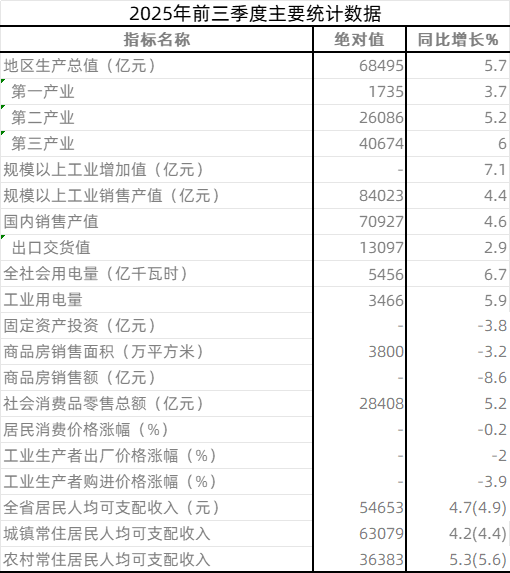 根据地区生产总值统一核算结果,前三季度,全省地区生产总值68495亿元,按不变价格计算,同比增长5.7%。分产业看,第一产业增加值1735亿元,增长3.7%;第二产业增加值26086亿元,增长5.2%;第三产业增加值40674亿元,增长6.0%。