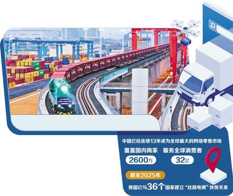 在全球舞台,电子商务的开放合作篇章同样精彩。截至2025年,我国已经与36个国家建立“丝路电商”伙伴关系,朋友圈遍及五大洲,我国跨境电商进出口额占货物进出口比重超6%,开放合作持续深化。