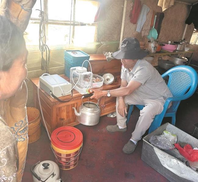 县疾控中心工作人员为牧民示范净水器用法。马振东 摄
