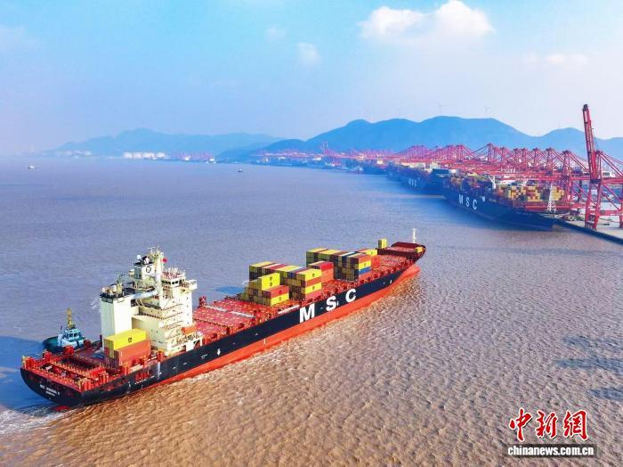 中新社宁波1月8日电(张斌)1月8日,随着澳大利亚航线首航货船“地中海杰西尼亚”轮靠泊宁波舟山港穿山港区,宁波舟山港迎来2026年首条新航线。