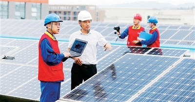 国网宁波供电公司员工主动靠前服务企业光伏项目并网投运,助力外贸企业低碳转型,应对碳关税挑战。