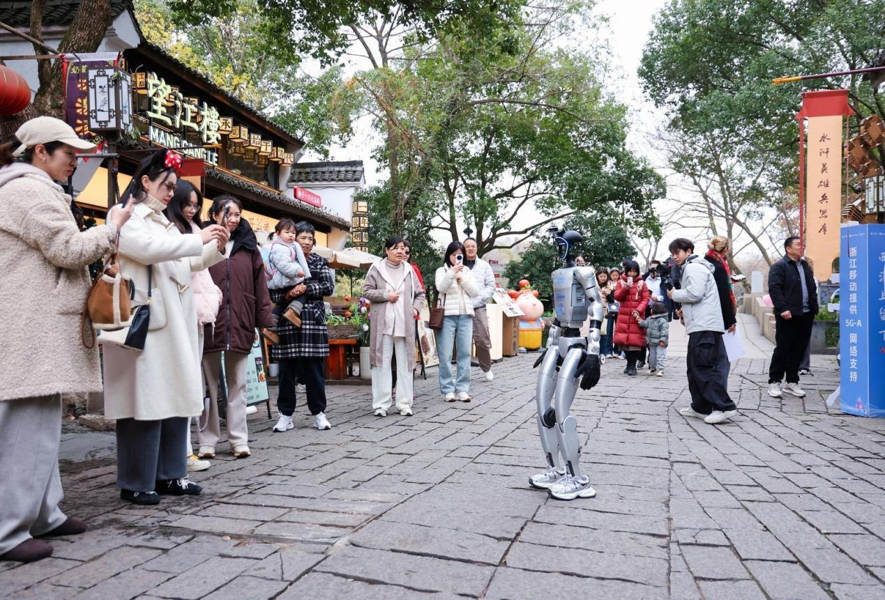 “小天,带我去最近的洗手间。”在望江楼,AI具身导览机器人“小天”能够根据语音指令带领游客前往指定地点。“小天”通过5G-A大上行技术,将机器人“所见、所听”实时上传云端大脑并推理,实时下发控制命令,实现低时延语音交互的类人流畅感,并实现多模态感知协同下的引导与自主跟随能力,带你体验最美西溪。
