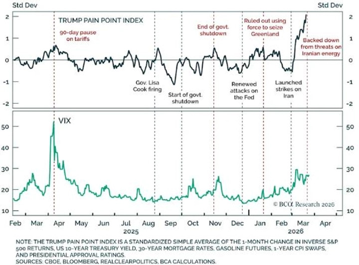 “TACO”模式是如此广为人知,以至于分析师们开发了类似 BCA Research 的“特朗普痛苦指数”之类的工具,用来预测政策转变何时可能发生。该指标追踪短期股市波动、长期国债收益率、抵押贷款利率、汽油价格、通胀预期以及总统的支持率。